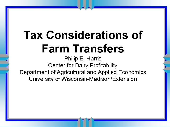 Tax Considerations of Farm Transfers Philip E. Harris Center for Dairy Profitability Department of Agricultural and Applied Economics University of Wisconsin-Madison/Extension