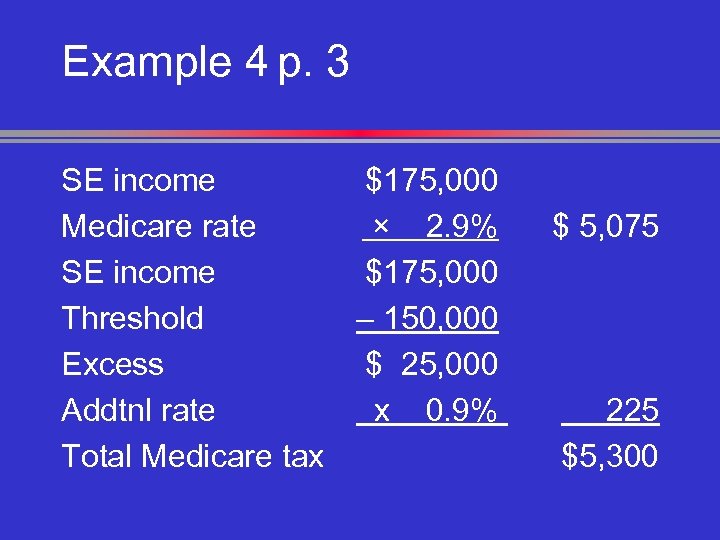 Example 4 p. 3 SE income $175, 000 Medicare rate × 2. 9% SE income $175, 000 Threshold – 150, 000 Excess $ 25, 000 Addtnl rate x 0. 9% Total Medicare tax $ 5, 075 225 $5, 300