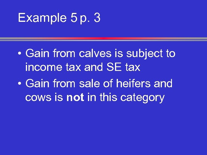 Example 5 p. 3 • Gain from calves is subject to income tax and SE tax • Gain from sale of heifers and cows is not in this category