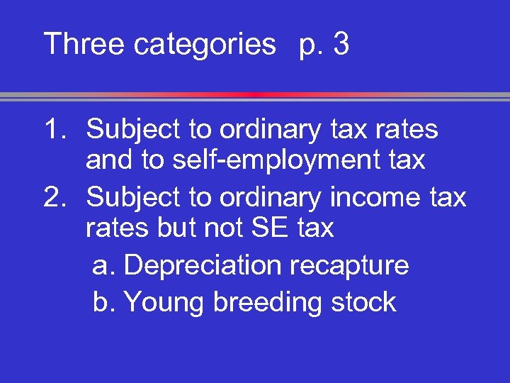 Three categories p. 3 1. Subject to ordinary tax rates and to self-employment tax 2. Subject to ordinary income tax rates but not SE tax a. Depreciation recapture b. Young breeding stock
