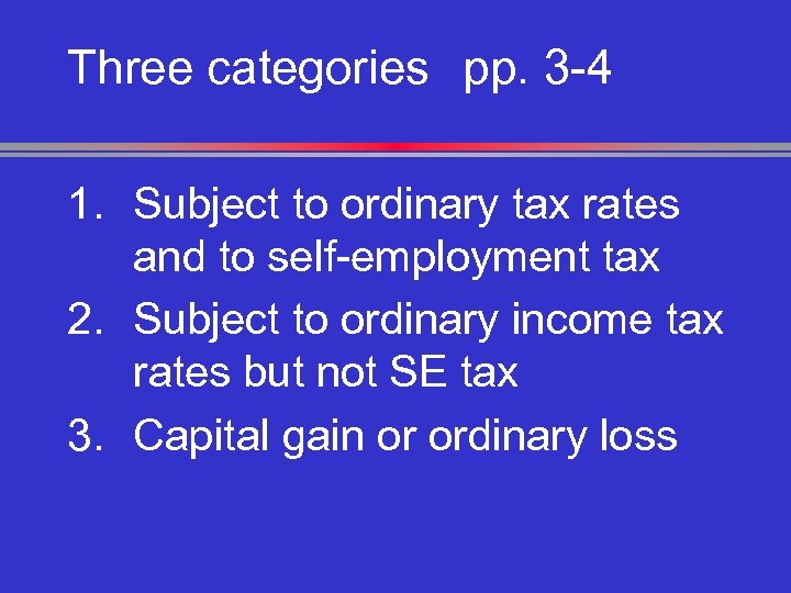 Three categories pp. 3 -4 1. Subject to ordinary tax rates and to self-employment tax 2. Subject to ordinary income tax rates but not SE tax 3. Capital gain or ordinary loss