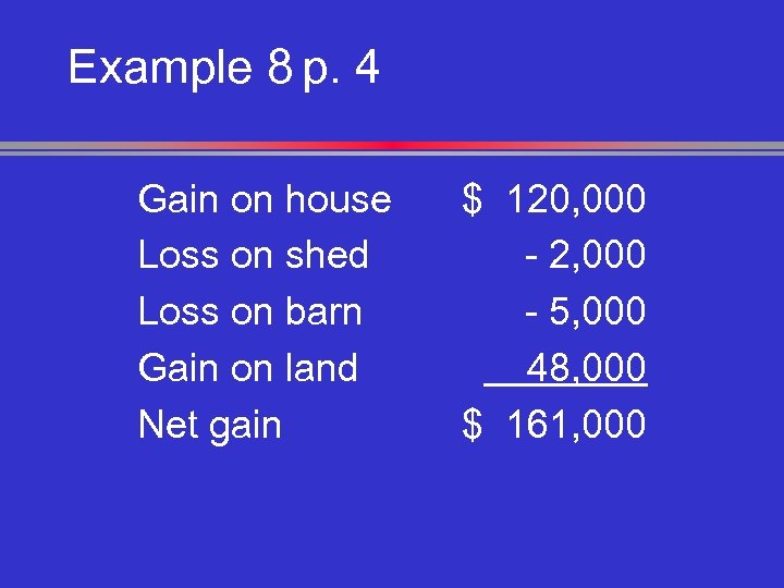 Example 8 p. 4 Gain on house Loss on shed Loss on barn Gain on land Net gain $ 120, 000 - 2, 000 - 5, 000 48, 000 $ 161, 000