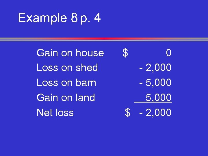 Example 8 p. 4 Gain on house Loss on shed Loss on barn Gain on land Net loss $ 0 - 2, 000 - 5, 000 $ - 2, 000