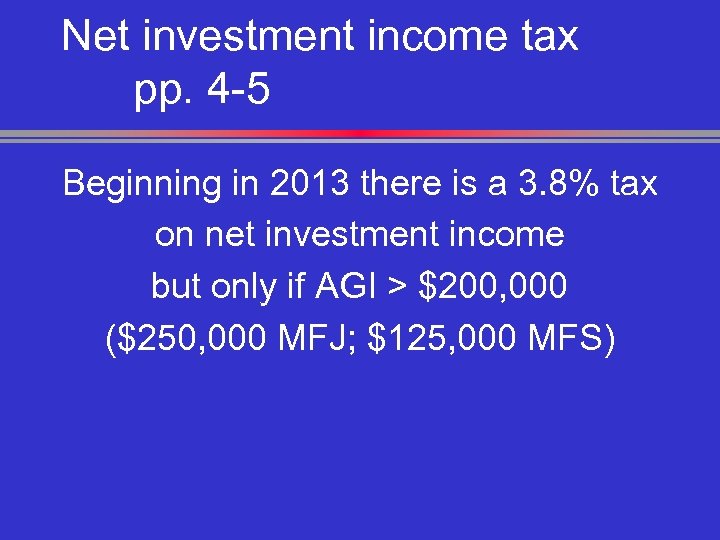 Net investment income tax pp. 4 -5 Beginning in 2013 there is a 3. 8% tax on net investment income but only if AGI > $200, 000 ($250, 000 MFJ; $125, 000 MFS)