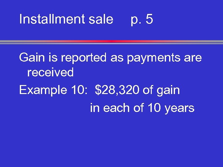 Installment sale p. 5 Gain is reported as payments are received Example 10: $28, 320 of gain in each of 10 years
