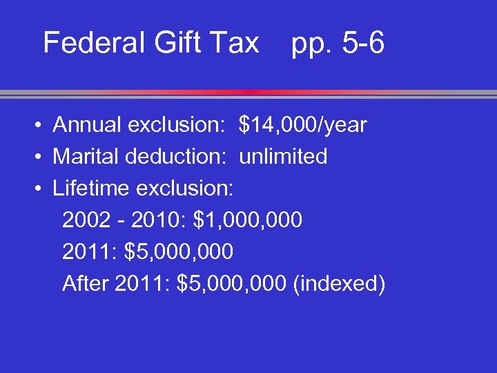 Federal Gift Tax pp. 5 -6 • Annual exclusion: $14, 000/year • Marital deduction: unlimited • Lifetime exclusion: 2002 - 2010: $1, 000 2011: $5, 000 After 2011: $5, 000 (indexed)
