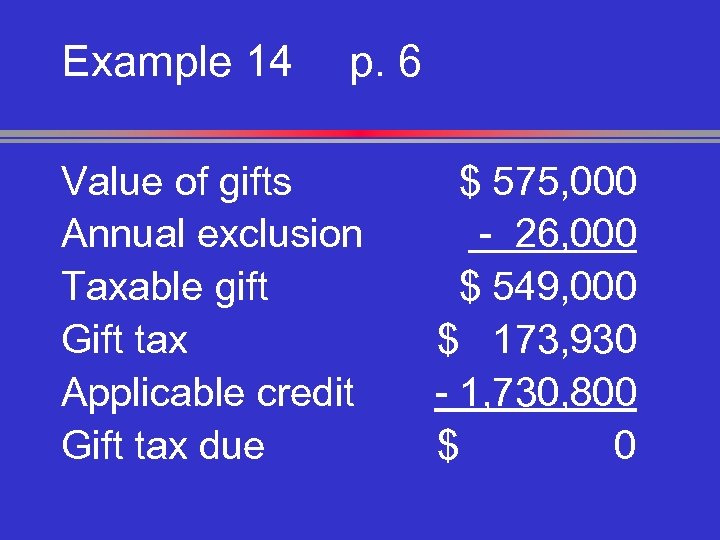 Example 14 p. 6 Value of gifts Annual exclusion Taxable gift Gift tax Applicable credit Gift tax due $ 575, 000 - 26, 000 $ 549, 000 $ 173, 930 - 1, 730, 800 $ 0