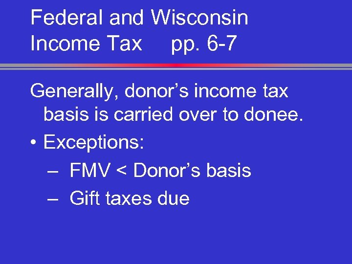 Federal and Wisconsin Income Tax pp. 6 -7 Generally, donor’s income tax basis is carried over to donee. • Exceptions: – FMV < Donor’s basis – Gift taxes due