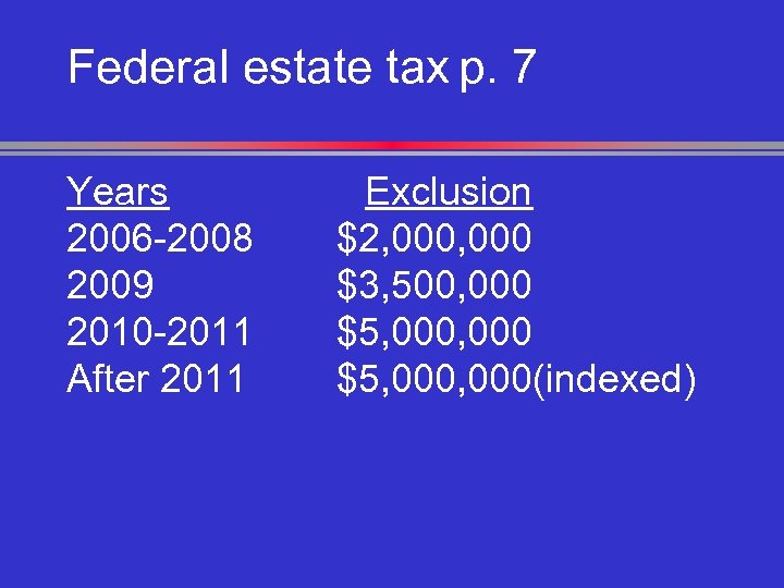 Federal estate tax p. 7 Years 2006 -2008 2009 2010 -2011 After 2011 Exclusion $2, 000 $3, 500, 000 $5, 000, 000(indexed)