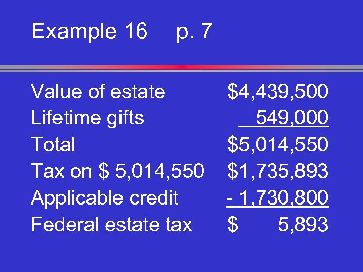 Example 16 p. 7 Value of estate Lifetime gifts Total Tax on $ 5, 014, 550 Applicable credit Federal estate tax $4, 439, 500 549, 000 $5, 014, 550 $1, 735, 893 - 1, 730, 800 $ 5, 893