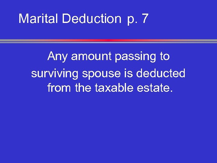 Marital Deduction p. 7 Any amount passing to surviving spouse is deducted from the taxable estate.