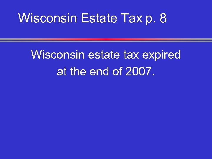 Wisconsin Estate Tax p. 8 Wisconsin estate tax expired at the end of 2007.
