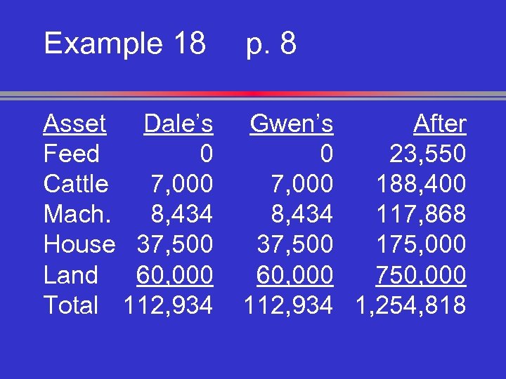 Example 18 p. 8 Asset Dale’s Feed 0 Cattle 7, 000 Mach. 8, 434 House 37, 500 Land 60, 000 Total 112, 934 Gwen’s After 0 23, 550 7, 000 188, 400 8, 434 117, 868 37, 500 175, 000 60, 000 750, 000 112, 934 1, 254, 818