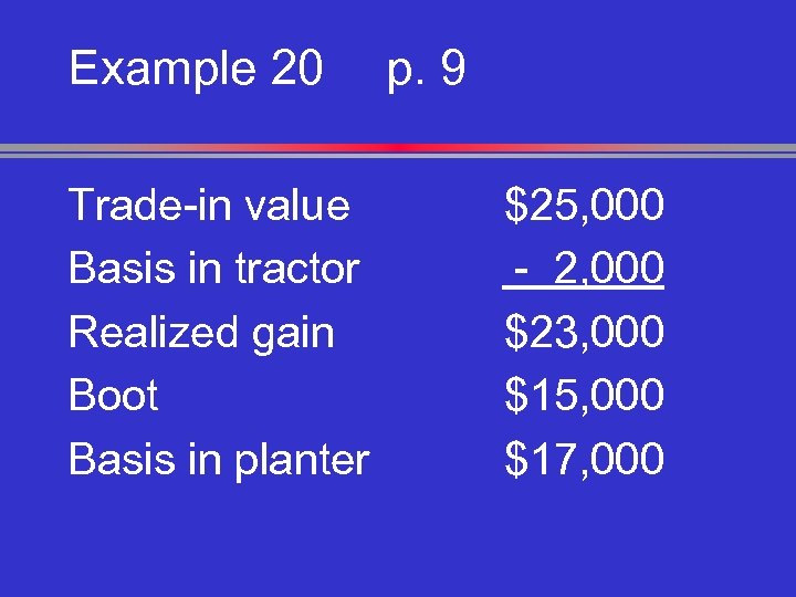 Example 20 Trade-in value Basis in tractor Realized gain Boot Basis in planter p. 9 $25, 000 - 2, 000 $23, 000 $15, 000 $17, 000