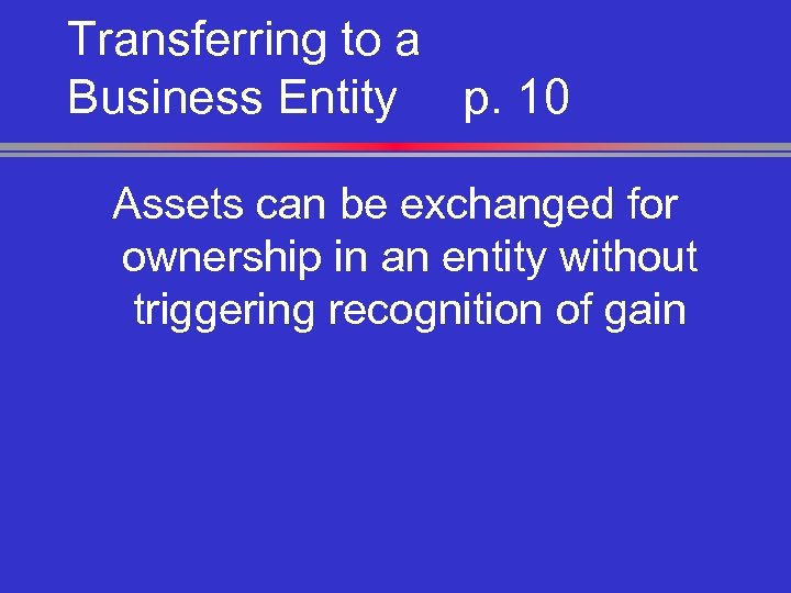 Transferring to a Business Entity p. 10 Assets can be exchanged for ownership in an entity without triggering recognition of gain