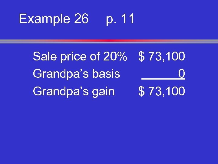 Example 26 p. 11 Sale price of 20% $ 73, 100 Grandpa’s basis 0 Grandpa’s gain $ 73, 100