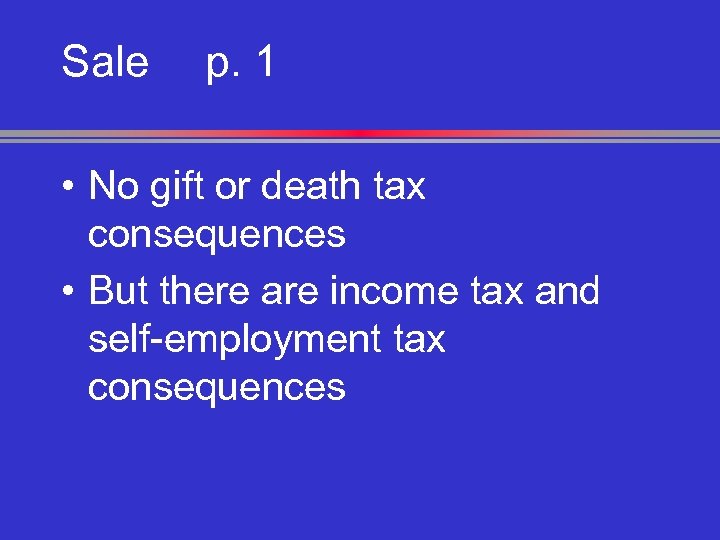 Sale p. 1 • No gift or death tax consequences • But there are income tax and self-employment tax consequences