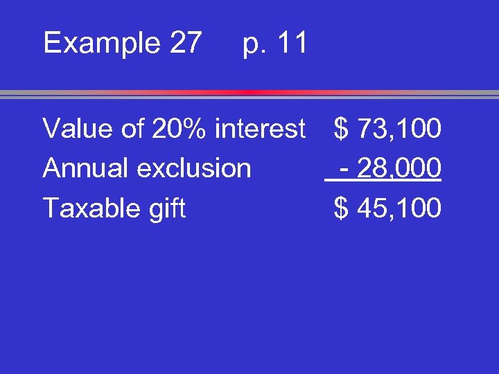 Example 27 p. 11 Value of 20% interest Annual exclusion Taxable gift $ 73, 100 - 28, 000 $ 45, 100