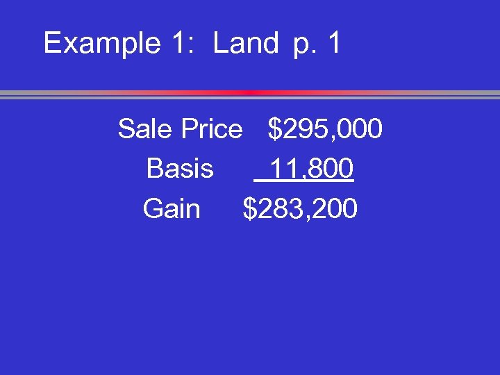 Example 1: Land p. 1 Sale Price $295, 000 Basis 11, 800 Gain $283, 200