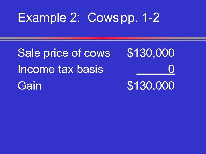 Example 2: Cows pp. 1 -2 Sale price of cows Income tax basis Gain $130, 000 0 $130, 000