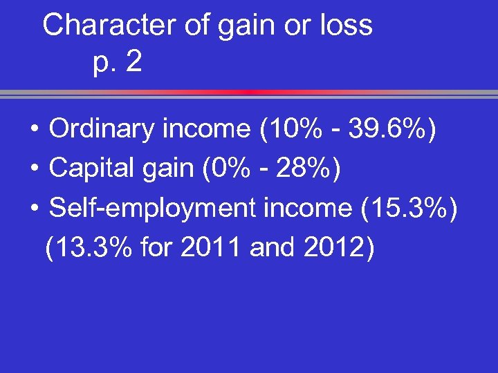 Character of gain or loss p. 2 • Ordinary income (10% - 39. 6%) • Capital gain (0% - 28%) • Self-employment income (15. 3%) (13. 3% for 2011 and 2012)