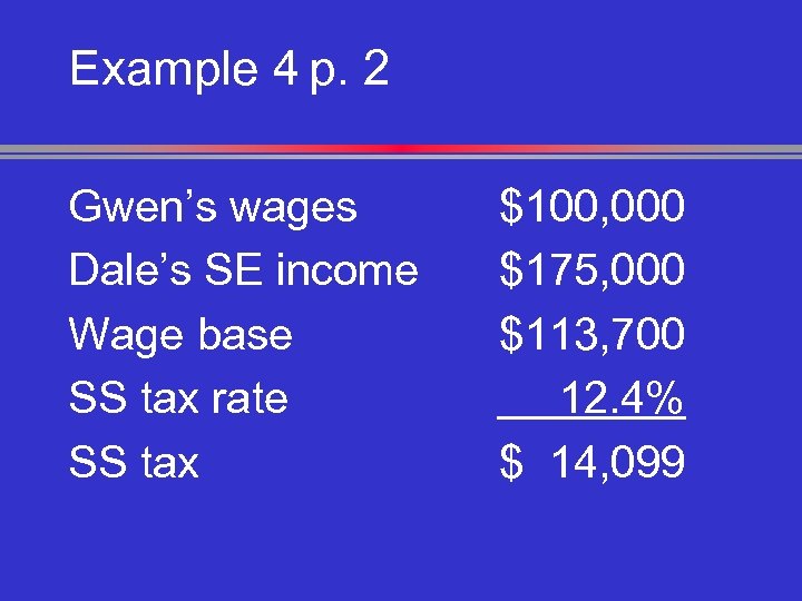 Example 4 p. 2 Gwen’s wages Dale’s SE income Wage base SS tax rate SS tax $100, 000 $175, 000 $113, 700 12. 4% $ 14, 099