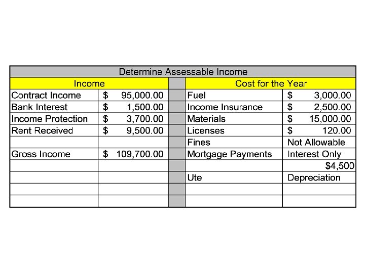 Taxable Income 08 -09 Tax Payable $0 -$6 000 Nil $6 001 - $34 000 15 c for each $1 over $6, 000 $34 000 - $80 000 $4, 200 plus 30 c for each $1 over $34, 000 $80, 001 – $180, 000 $18, 000 plus 40 c for each $1 over $80, 000 $180, 001 and over $58, 000 plus 45 c for each $1 over $180, 000 Determine Assessable Income and Tax Payable for Individual Money Received Contract Income $95 000 Bank Interest $1 500 Income Protection $3 700 Rent Received $9 500 Costs for the Year Fuel for work Vehicle $ 3 000 Income Insurance $ 2 500 Materials $15 000 Workcover Licensing $ 120 Work Cover Fine $ 1 500 Mortgage Payments $12 000 ($2500 Int) Ute Purchase 1/7/xxxx $35 000