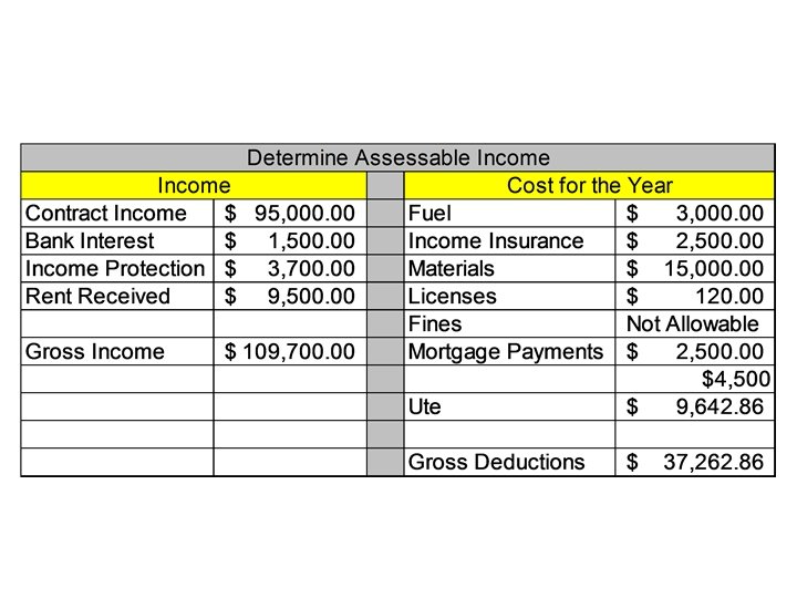 • COMPANY TAX Companies are taxed at a flat rate of 30% with no tax free threshold Determine Assessable Income and Tax Payable for Individual Money Received Contract Income $95 000 Bank Interest $1 500 Income Protection $3 700 Rent Received $9 500 Costs for the Year Fuel for work Vehicle $ 3 000 Income Insurance $ 2 500 Materials $15 000 Workcover Licensing $ 120 Work Cover Fine $ 1 500 Mortgage Payments $12 000 ($2500 Int) Ute Purchase 1/7/xxxx $35 000