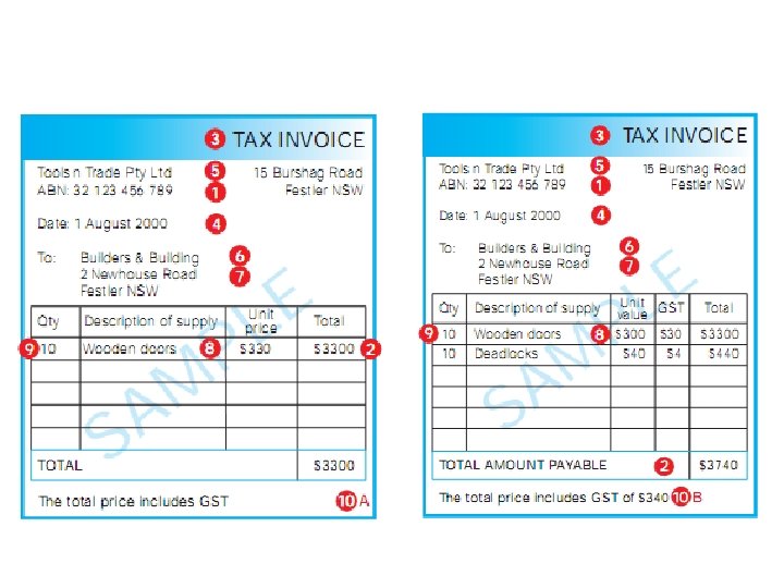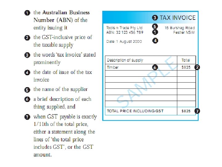Tax Invoices less than $1000 • Tax Invoices must be issued for sales > $82. 50 GST Inclusive (2009) • the words ‘tax invoice’ stated prominently • the name of the supplier • the ABN of the supplier • the date of issue of the tax invoice • a brief description of the goods or services sold, and • the total price of the sales (including GST).
