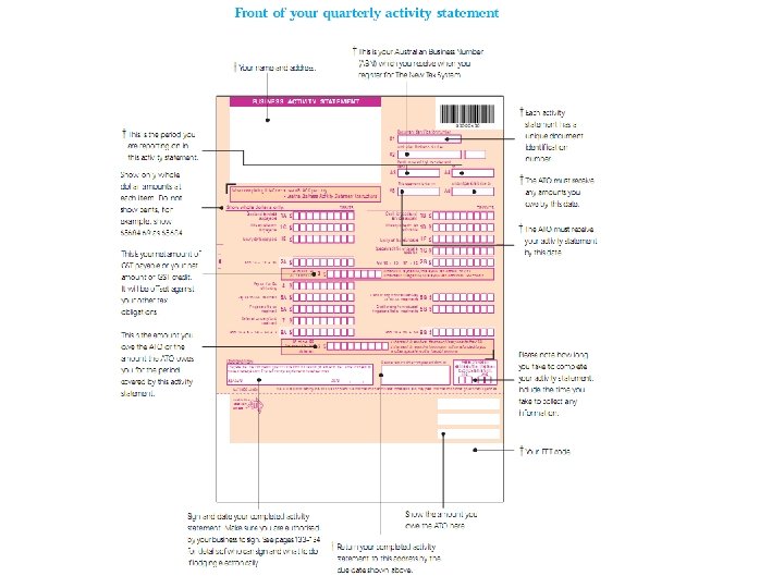 Business Activity Statement • Form submitted to the ATO to report tax obligations • Including – GST – PAYGW – PAYGI – Wine Equalization Tax (WET) & – Luxury Car Tax (LCT)