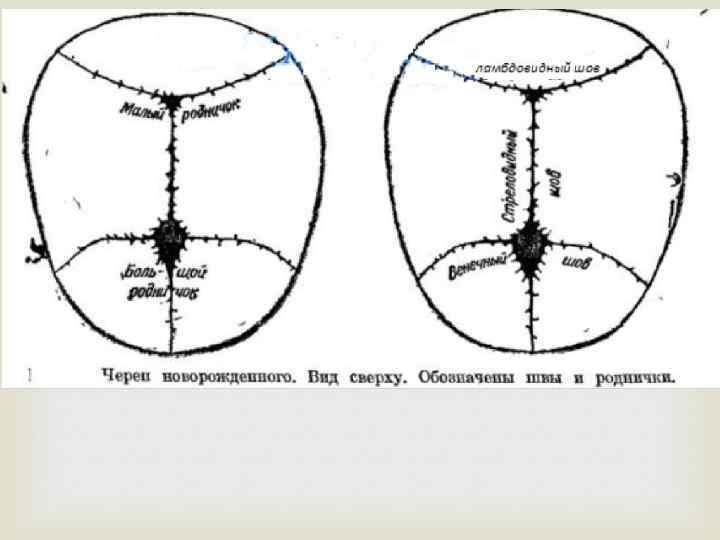 Большой родничок, или передний (fonticulus magnus), имеет форм> ромба. В центре между четырьмя костями (двумя лоб ными и двумя теменными) к нему сходятся четыре шва лоб ный, стреловидный и две ветви венечного) Малый родничок (f. parvus), или задний, представляет собой небольшое углубление, в котором сходятся три шва стрело видный и обе ножки лямбдовидного.