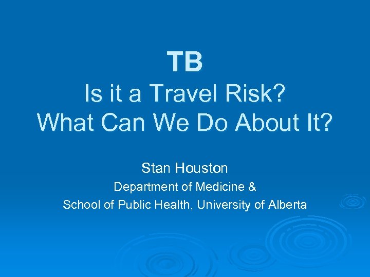 TB Is it a Travel Risk? What Can We Do About It? Stan Houston Department of Medicine & School of Public Health, University of Alberta