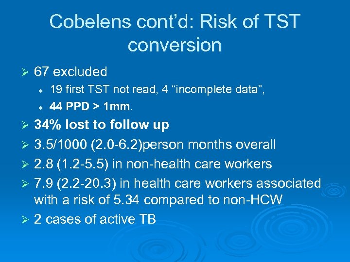 Cobelens cont’d: Risk of TST conversion Ø 67 excluded l l 19 first TST not read, 4 “incomplete data”, 44 PPD > 1 mm. 34% lost to follow up Ø 3. 5/1000 (2. 0 -6. 2)person months overall Ø 2. 8 (1. 2 -5. 5) in non-health care workers Ø 7. 9 (2. 2 -20. 3) in health care workers associated with a risk of 5. 34 compared to non-HCW Ø 2 cases of active TB Ø