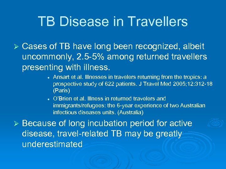 TB Disease in Travellers Ø Cases of TB have long been recognized, albeit uncommonly, 2. 5 -5% among returned travellers presenting with illness. l l Ø Ansart et al. Illnesses in travelers returning from the tropics: a prospective study of 622 patients. J Travel Med 2005; 12: 312 -18 (Paris) O’Brien et al. Illness in returned travelers and immigrants/refugees: the 6 -year experience of two Australian infectious diseases units. (Australia) Because of long incubation period for active disease, travel-related TB may be greatly underestimated