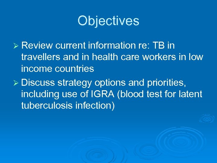 Objectives Ø Review current information re: TB in travellers and in health care workers in low income countries Ø Discuss strategy options and priorities, including use of IGRA (blood test for latent tuberculosis infection)