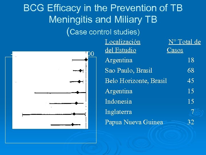 BCG Efficacy in the Prevention of TB Meningitis and Miliary TB (Case control studies) -100 -50 0 50 100 Localización del Estudio Argentina Sao Paulo, Brasil N° Total de Casos 18 68 Belo Horizonte, Brasil 45 Argentina 15 Indonesia Inglaterra Papua Nueva Guinea 15 7 32