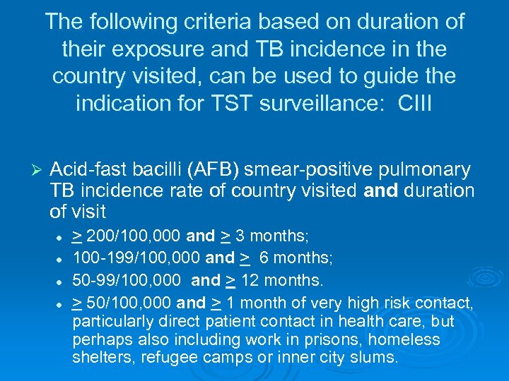 The following criteria based on duration of their exposure and TB incidence in the country visited, can be used to guide the indication for TST surveillance: CIII Ø Acid-fast bacilli (AFB) smear-positive pulmonary TB incidence rate of country visited and duration of visit l l > 200/100, 000 and > 3 months; 100 -199/100, 000 and > 6 months; 50 -99/100, 000 and > 12 months. > 50/100, 000 and > 1 month of very high risk contact, particularly direct patient contact in health care, but perhaps also including work in prisons, homeless shelters, refugee camps or inner city slums.