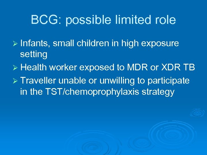 BCG: possible limited role Ø Infants, small children in high exposure setting Ø Health worker exposed to MDR or XDR TB Ø Traveller unable or unwilling to participate in the TST/chemoprophylaxis strategy
