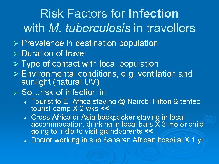 Risk Factors for Infection with M. tuberculosis in travellers Prevalence in destination population Duration of travel Type of contact with local population Environmental conditions, e. g. ventilation and sunlight (natural UV) Ø So…risk of infection in Ø Ø l l l Tourist to E. Africa staying @ Nairobi Hilton & tented tourist camp X 2 wks << Cross Africa or Asia backpacker staying in local accommodation, drinking in local bars X 3 mo or child going to India to visit grandparents << Doctor working in sub Saharan African hospital X 1 yr