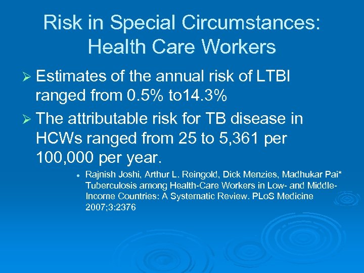 Risk in Special Circumstances: Health Care Workers Ø Estimates of the annual risk of LTBI ranged from 0. 5% to 14. 3% Ø The attributable risk for TB disease in HCWs ranged from 25 to 5, 361 per 100, 000 per year. l Rajnish Joshi, Arthur L. Reingold, Dick Menzies, Madhukar Pai* Tuberculosis among Health-Care Workers in Low- and Middle. Income Countries: A Systematic Review. PLo. S Medicine 2007; 3: 2376