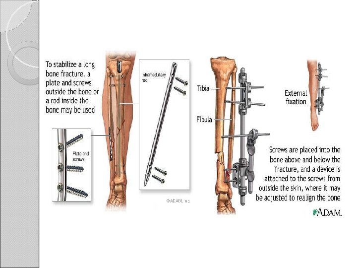 Internal Fixation Indications: 1. Fractures that cannot be reduced except by operation 2. Fractures that are unstable (prone to re-displacement) 3. Fractures that unite poorly and slowly (e. g femoral neck fracture) 4. Pathological fractures 5. Multiple fractures 6. Patients with nursing difficulties Types – screws, wires, plates&screws, intramedullary nails Complications: (due to poor techniques, poor equipment operating conditions) – infection, non-union, implant failures, refracture External fixation Principle – bone is transfixed above and below the fractures with screws/pins/wires which are clamped to a frame Indications: 1. Fractures associated with severe soft tissue damage 2. Severely comminuted and unstable fractures 3. Pelvic fracture 4. Fractures a/w nerve or vessel damages 5. Infected fractures 6. Ununited fractures Complications: -Damage to soft-tissue structures -Over-distraction -Pin-tract infection