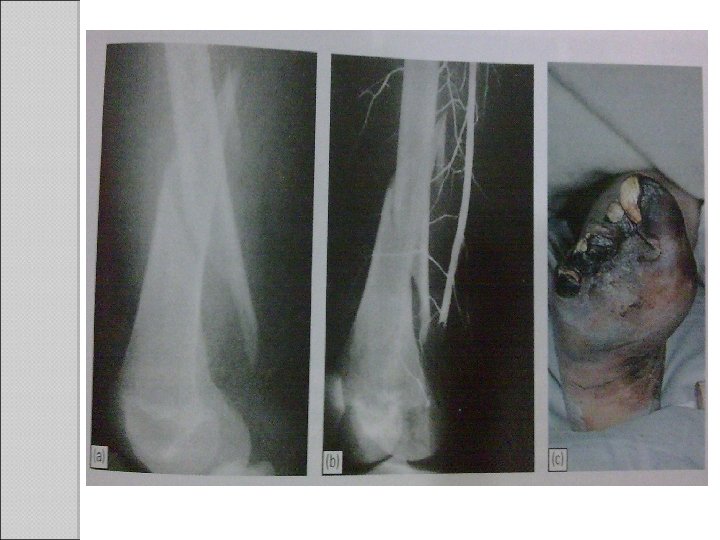 Clinical features Paraesthesia /numbness of toes/fingers Cold, pale, slightly cyanosed weak/absent pulse X ray shows high risk fractures Management Angiogram Remove bandages/splint X ray – kinking or compressed reduction Reassess circulation No improvement explore via operation ◦ Torn Suture/ replace by vein graft ◦ Thrombosed endarterectomy to restore blood flow