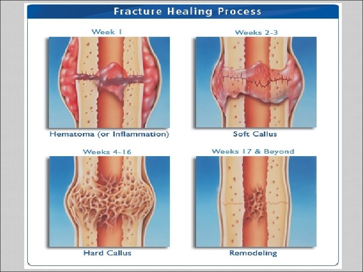 Fracture Healing Process Stage 1: start few days after injury and continue for about a month. Stage 2: starts within a week or two and continues for many months. Stage 3: continues for many month to a few years.