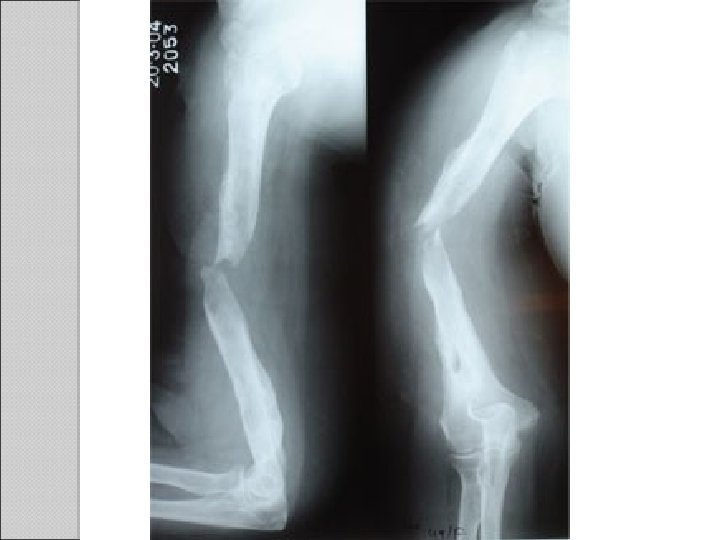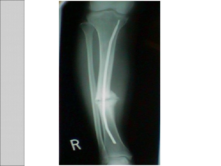 Atrophic Non- Union Features §Osteogenesis is ceased §No sign of attempted bridging §Inert and incapable of biologic rxn §Poor blood supply to the ends of fragments §Cold bone scan §Bone ends are tapered or rounded (Xray) Management §Rigid fixation §Excised the sclerotic end of bone ends and the fibrous tissue that filled the gap §Bone graft around the fracture
