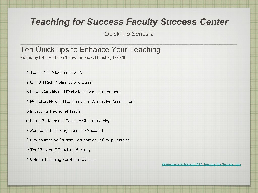 Teaching for Success Faculty Success Center Quick Tip Series 2 Ten Quick. Tips to Enhance Your Teaching Edited by John H. (Jack) Shrawder, Exec. Director, TFS FSC 1. Teach Your Students to S. I. N. 2. Un! Oh! Right Notes; Wrong Class 3. How to Quickly and Easily Identify At-risk Learners 4. Portfolios: How to Use them as an Alternative Assessment 5. Improving Traditional Testing 6. Using Performance Tasks to Check Learning 7. Zero-based Thinking—Use it to Succeed 8. How to Improve Student Participation in Group Learning 9. The “Bookend” Teaching Strategy 10. Better Listening For Better Classes © Pentronics Publishing 2010, Teaching For Success. com 1