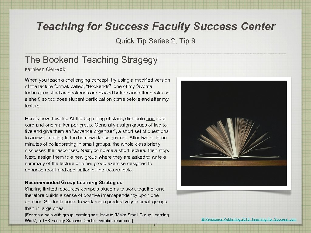 Teaching for Success Faculty Success Center Quick Tip Series 2; Tip 9 The Bookend Teaching Stragegy Kathleen Ciez-Volz When you teach a challenging concept, try using a modified version of the lecture format, called, “Bookends” one of my favorite techniques. Just as bookends are placed before and after books on a shelf, so too does student participation come before and after my lecture. Here’s how it works. At the beginning of class, distribute one note card and one marker per group. Generally assign groups of two to five and give them an “advance organizer”, a short set of questions to answer relating to the homework assignment. After two or three minutes of collaborating in small groups, the whole class briefly discusses the responses. Next, complete a short lecture, then stop. Next, assign them to a new group where they are asked to write a summary of the lecture or other group exercise designed to enhance recall and application of the lecture topic. Recommended Group Learning Strategies Sharing limited resources compels students to work together and therefore builds a sense of positive interdependency upon one another. Students seem to work more productively in small groups than in large ones. [For more help with group learning see: How to “Make Small Group Learning © Pentronics Publishing 2010, Teaching For Success. com Work”, a TFS Faculty Success Center member resource. ] 10