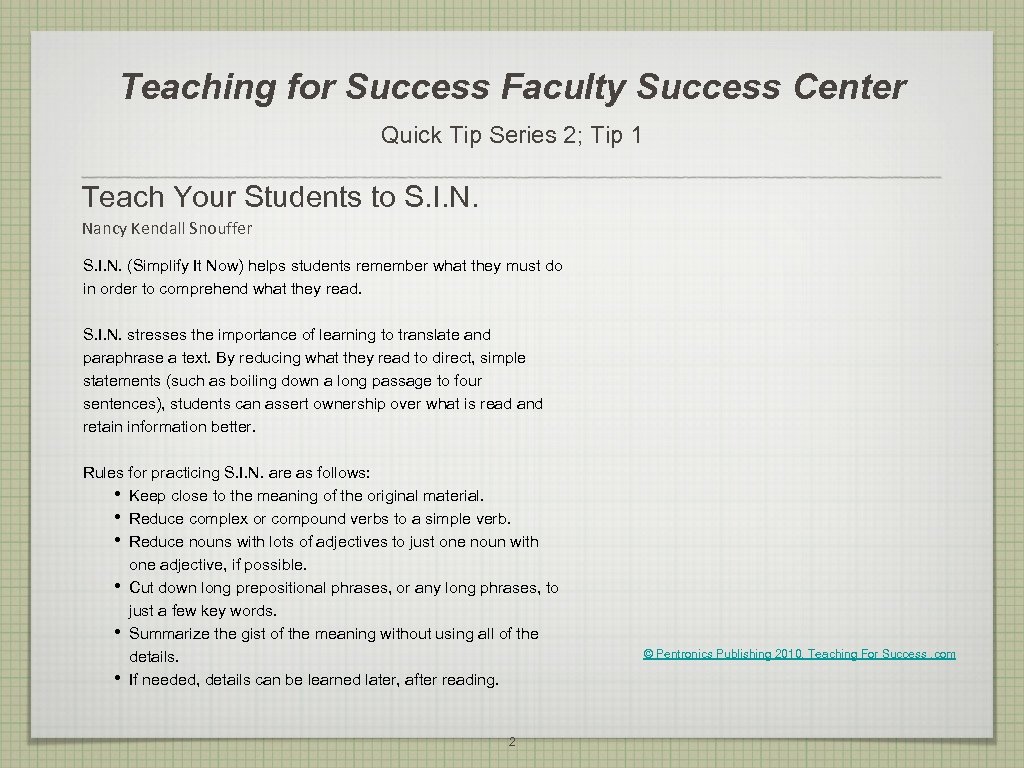 Teaching for Success Faculty Success Center Quick Tip Series 2; Tip 1 Teach Your Students to S. I. N. Nancy Kendall Snouffer S. I. N. (Simplify It Now) helps students remember what they must do in order to comprehend what they read. S. I. N. stresses the importance of learning to translate and paraphrase a text. By reducing what they read to direct, simple statements (such as boiling down a long passage to four sentences), students can assert ownership over what is read and retain information better. Rules for practicing S. I. N. are as follows: • Keep close to the meaning of the original material. • Reduce complex or compound verbs to a simple verb. • Reduce nouns with lots of adjectives to just one noun with one adjective, if possible. • Cut down long prepositional phrases, or any long phrases, to just a few key words. • Summarize the gist of the meaning without using all of the details. • If needed, details can be learned later, after reading. 2 © Pentronics Publishing 2010, Teaching For Success. com