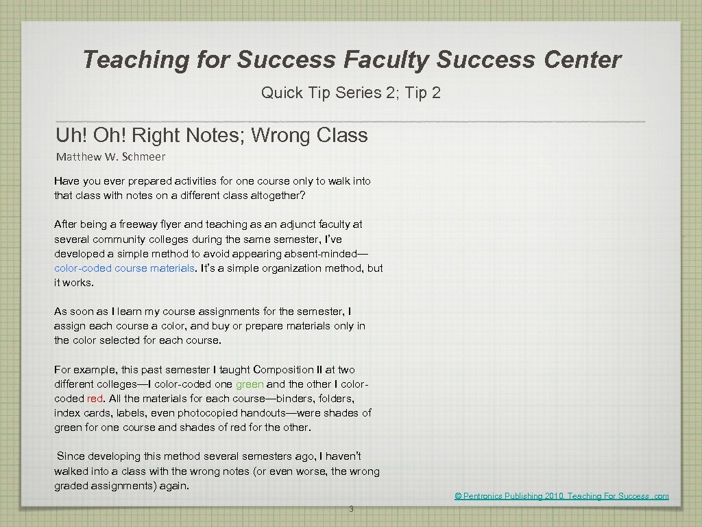 Teaching for Success Faculty Success Center Quick Tip Series 2; Tip 2 Uh! Oh! Right Notes; Wrong Class Matthew W. Schmeer Have you ever prepared activities for one course only to walk into that class with notes on a different class altogether? After being a freeway flyer and teaching as an adjunct faculty at several community colleges during the same semester, I’ve developed a simple method to avoid appearing absent-minded— color-coded course materials. It’s a simple organization method, but it works. As soon as I learn my course assignments for the semester, I assign each course a color, and buy or prepare materials only in the color selected for each course. For example, this past semester I taught Composition II at two different colleges—I color-coded one green and the other I colorcoded red. All the materials for each course—binders, folders, index cards, labels, even photocopied handouts—were shades of green for one course and shades of red for the other. Since developing this method several semesters ago, I haven’t walked into a class with the wrong notes (or even worse, the wrong graded assignments) again. © Pentronics Publishing 2010, Teaching For Success. com 3