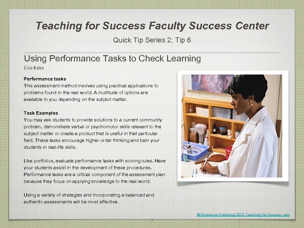 Teaching for Success Faculty Success Center Quick Tip Series 2; Tip 6 Using Performance Tasks to Check Learning Lisa Kokx Performance tasks This assessment method involves using practical applications to problems found in the real world. A multitude of options are available to you depending on the subject matter. Task Examples You may ask students to provide solutions to a current community problem, demonstrate verbal or psychomotor skills relevant to the subject matter or create a product that is useful in that particular field. These tasks encourage higher-order thinking and train your students in real-life skills. Like portfolios, evaluate performance tasks with scoring rules. Have your students assist in the development of these procedures. Performance tasks are a critical component of the assessment plan because they focus on applying knowledge to the real world. Using a variety of strategies and incorporating a balanced and authentic assessments will be most effective. © Pentronics Publishing 2010, Teaching For Success. com 7