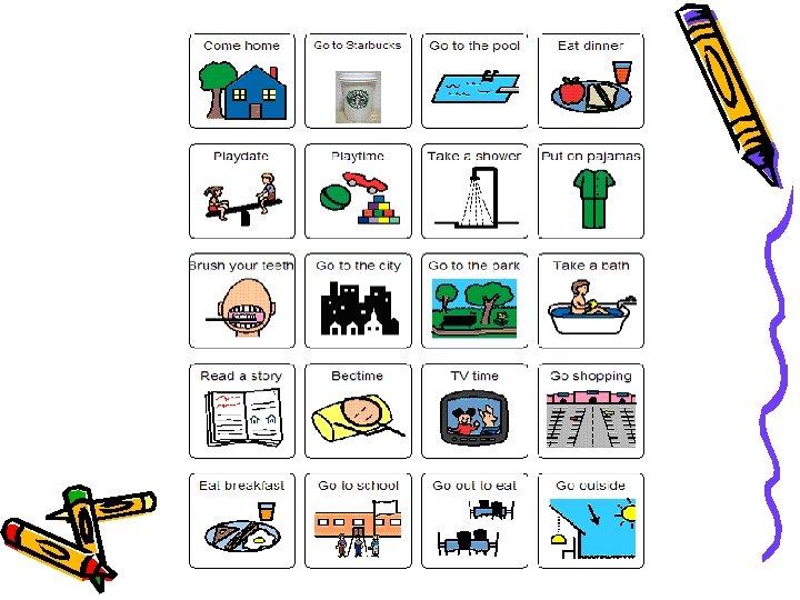 Daily Schedules • As the child becomes “fluent” with following picture schedules and begins to read, a written schedule may be used • With text on the pictures of the schedule, the pictures can be faded while the text becomes more prominent • You can have older children write out their schedule in a notebook, on a dry-erase board, on a piece of paper or in a school agenda